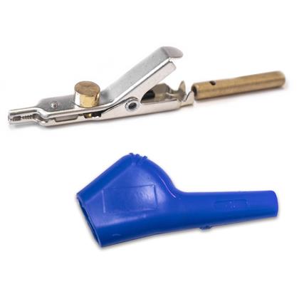 The JP-33674-TJ-B6 is a large, nickel silver telecom clip with a bed of nails and insulation-piercing spike in the jaw. This version features an 8-32 threaded barrel at the rear of the clip which is compatible with test leads that have an 8-32 threaded stud. Also includes a blue, flexible PVC insulator.